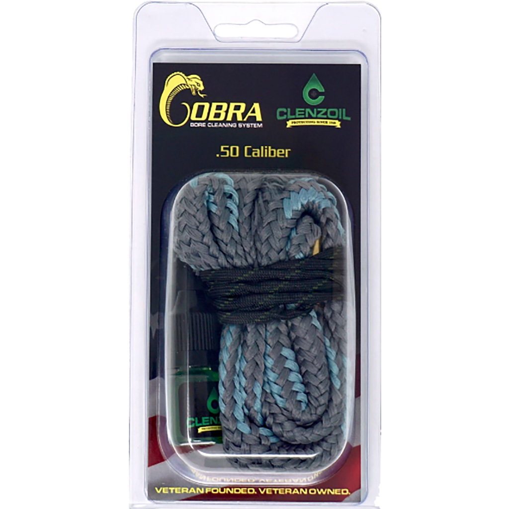 .50 Cal.;Provides a quick and easy solution to regular firearm maintenance.;Integrated bronze brush effectively loosens fouling and lead, and the woven cotton braid that follows collects the debris.;Completely washable, the Clenzoil Cobra can be reused over and over again.
